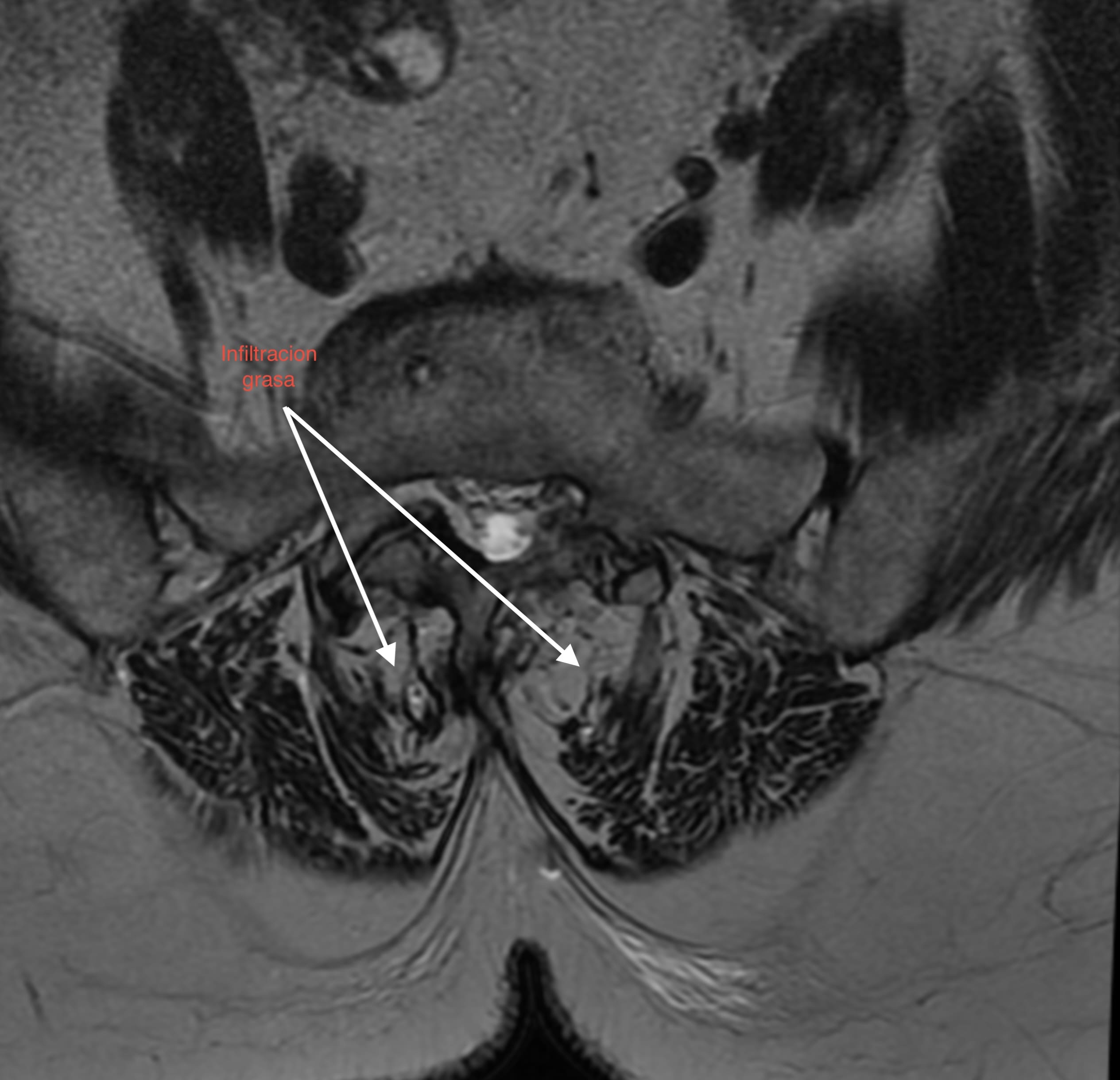 1. Pérdida del «Tirante» Dinámico: Los músculos multífidos actúan como estabilizadores segmentarios finos. En pacientes sarcopénicos, estos músculos son reemplazados por tejido adiposo no contráctil, perdiendo su capacidad de tensión.